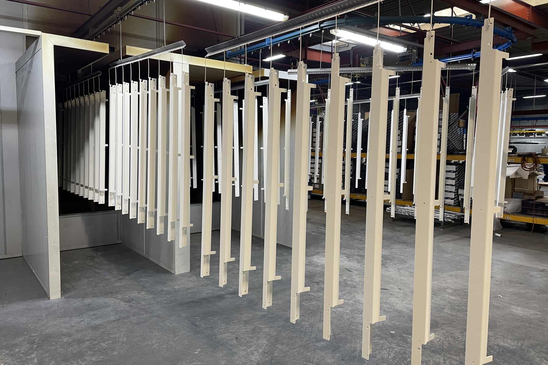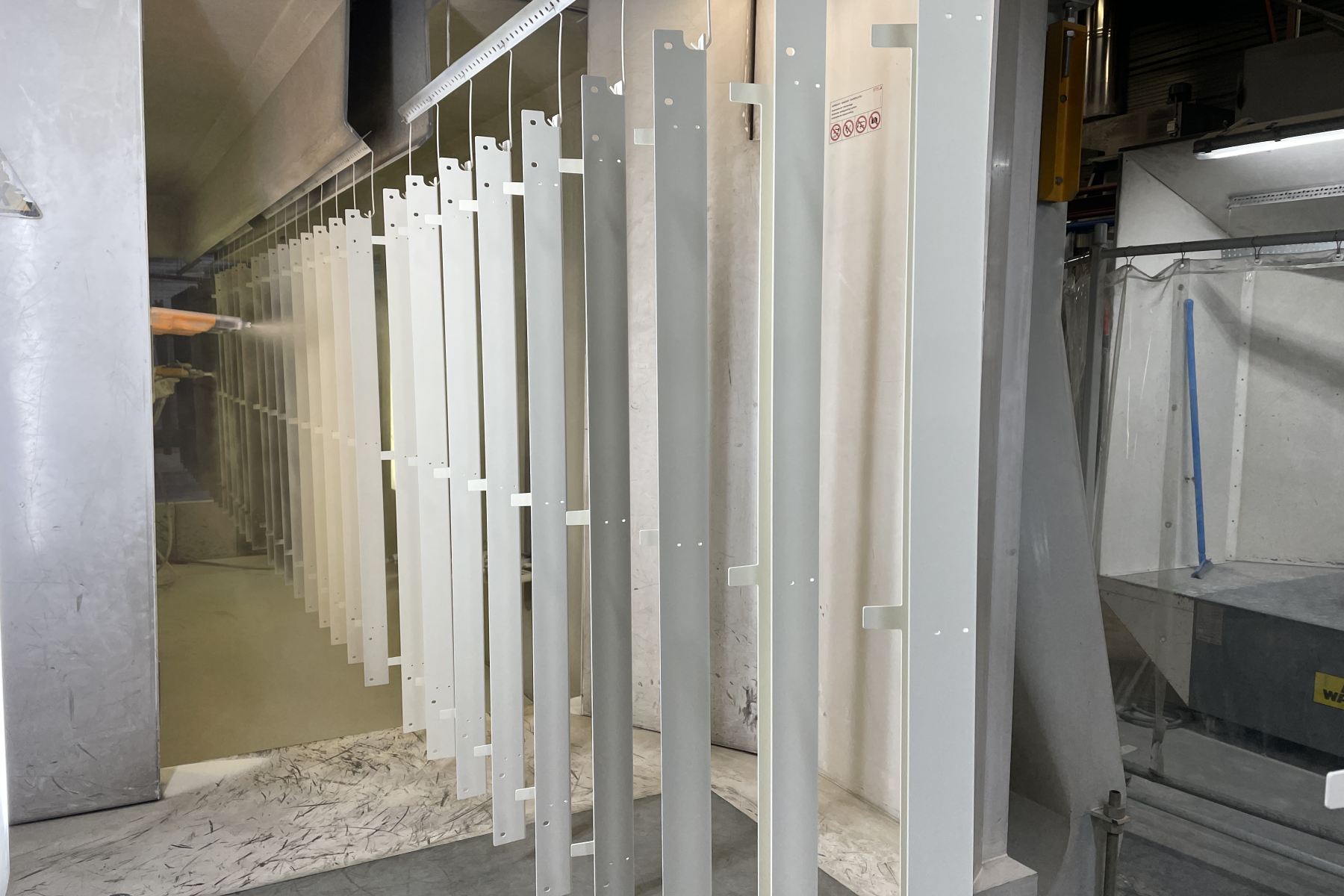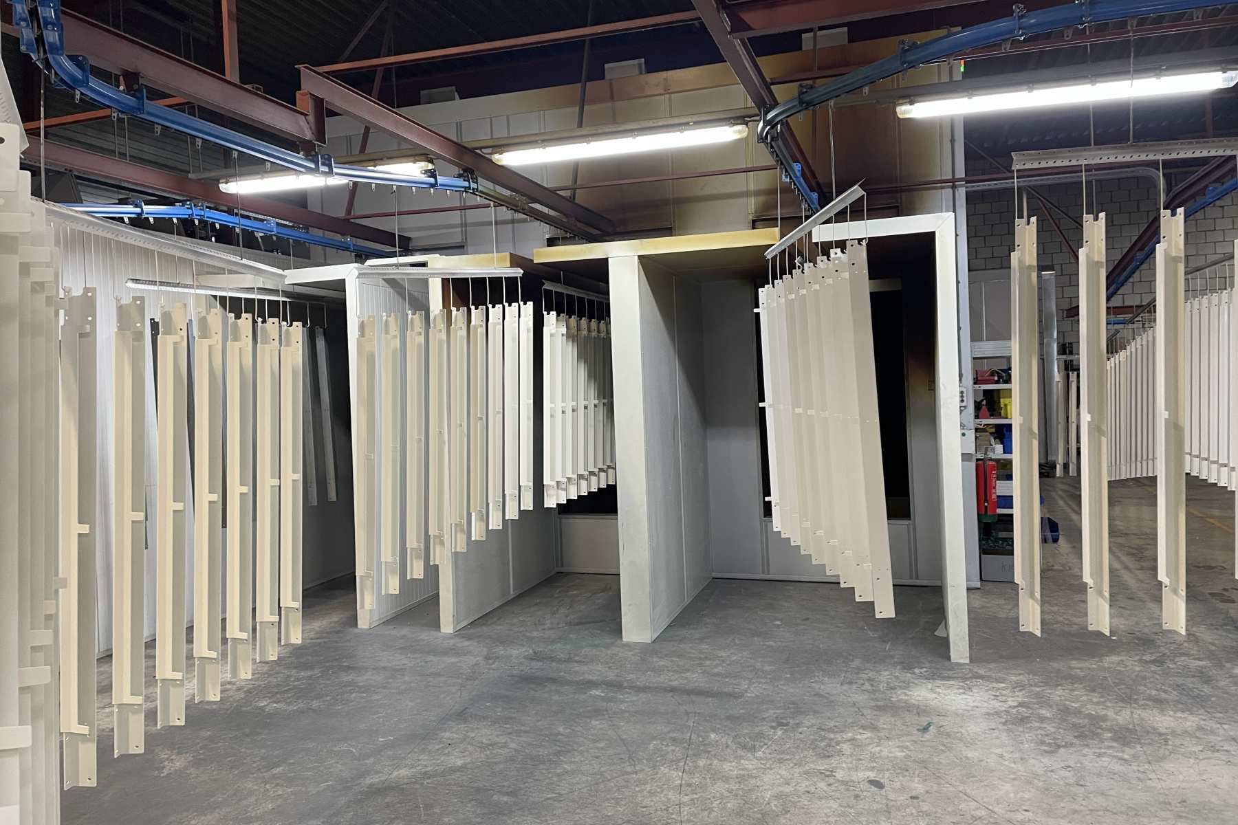 Na het voorbehandelings proces werden alle profielen naar de spuitcabines gebracht om hier de poedercoating aan te brengen. Ze zijn hier gespoten in poedercoating met de kleur RAL 9010 glans.
