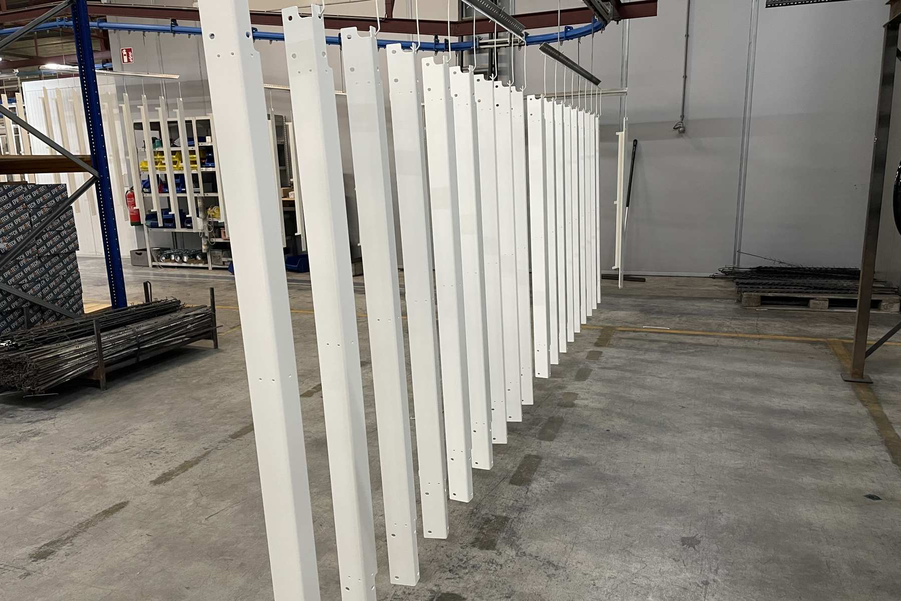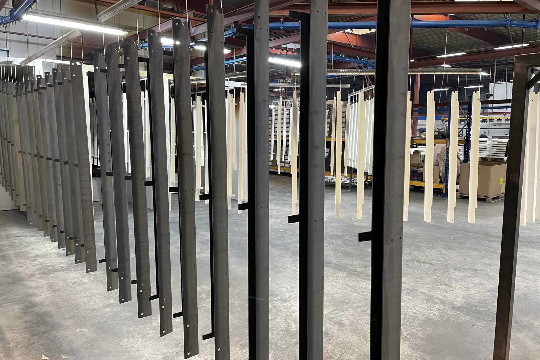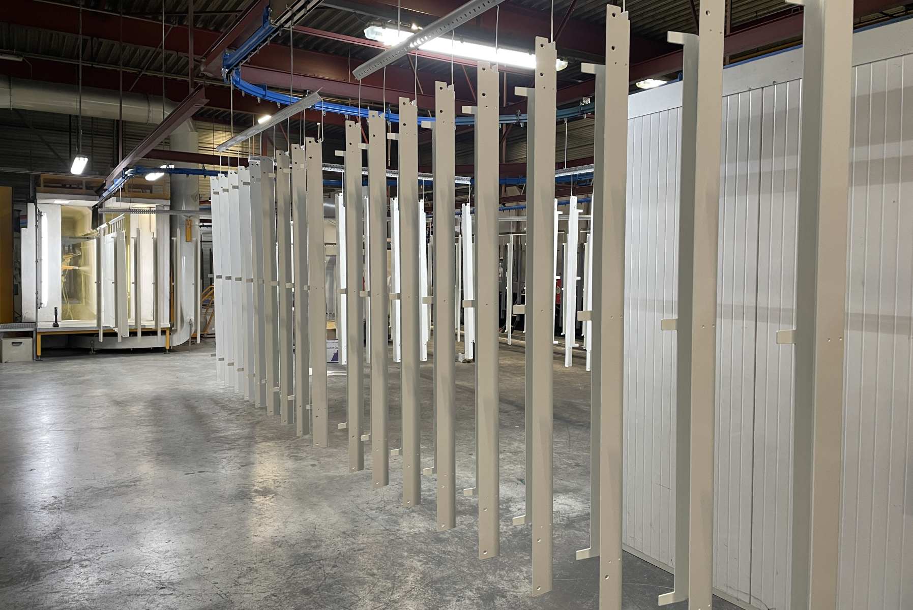 Na het voorbehandelings proces werden alle profielen naar de spuitcabines gebracht om hier de poedercoating aan te brengen. Ze zijn hier gespoten in poedercoating met de kleur RAL 9010 glans.
