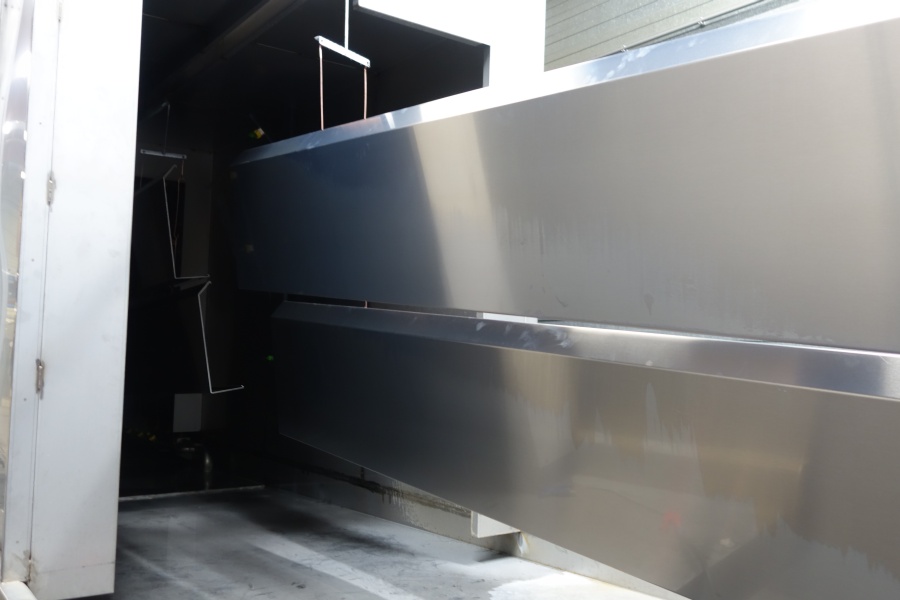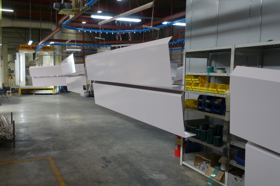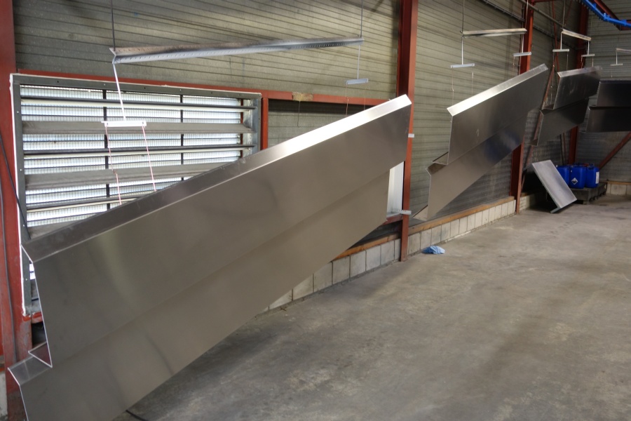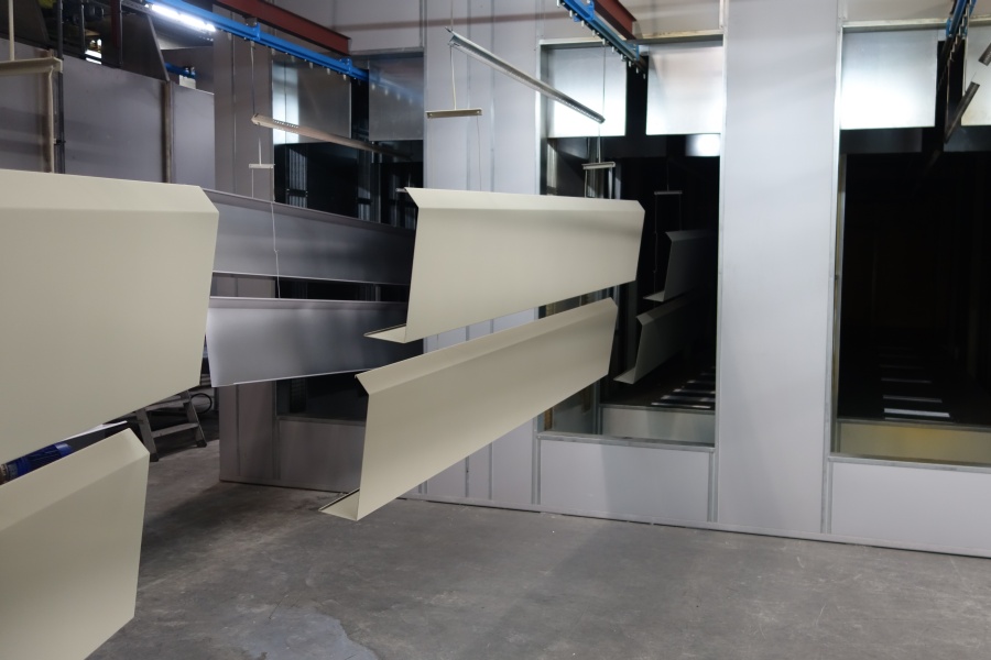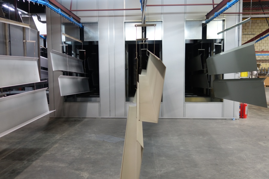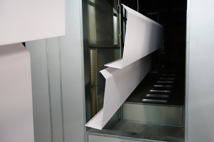 De aluminium dakranden die wij voor deze klant hebben gecoat mochten niet krom worden in het moffelproces. In goed onderling overleg is daarom bepaald waar de ophanggaatjes moesten komen. De dakranden konden probleemloos de moffeloven in en zijn na het aanbrengen van de primerlaag op 180 graden en na de toplaag op 190 graden gemoffeld.