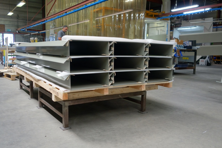 Bij het coaten van de aluminium dakranden is gekozen voor een 2-lagen systeem. Na het chemisch voorbehandelen van de 80 dakranden van 1,5 mm dik en 3000 mm lang, is er een epoxy primerlaag aangebracht en een polyester toplaag in RAL kleur 7023.
