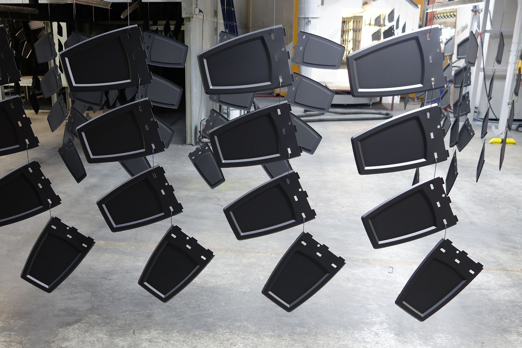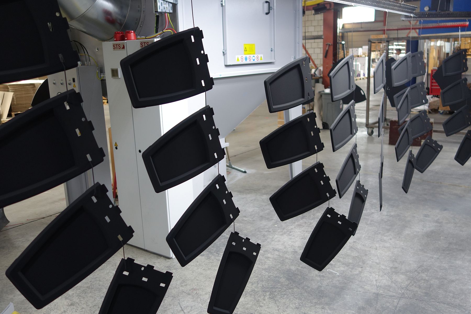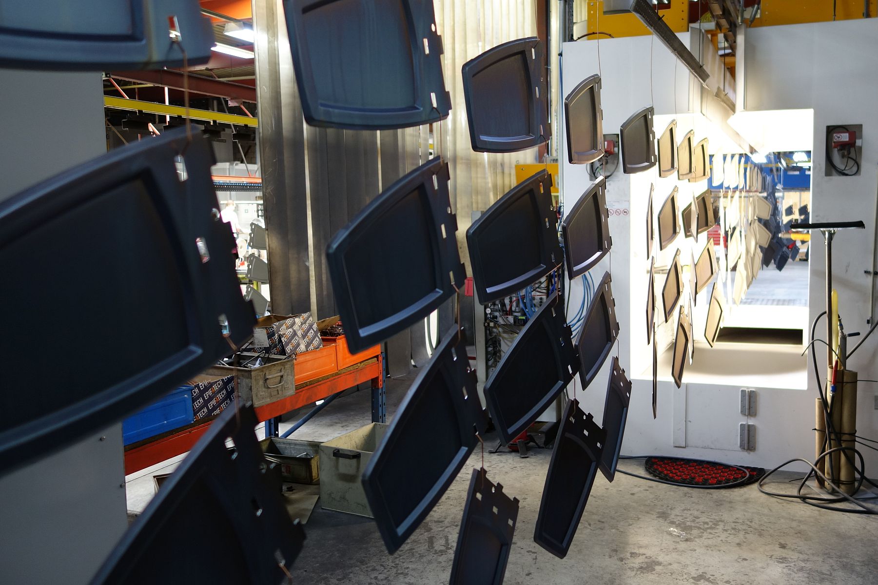 De voorbehandelde grondplaten werden naar de spuitcabines overgebracht. Hier werden ze gespoten in 60µm epoxy poedercoating in de kleur RAL 9011 doodmat met 5 glanspunten. Door dit type coating zijn de grondplaten nu zeer goed bestand tegen vocht en chemicaliën. De grondplaten zijn nu voorbereid op binnengebruik.