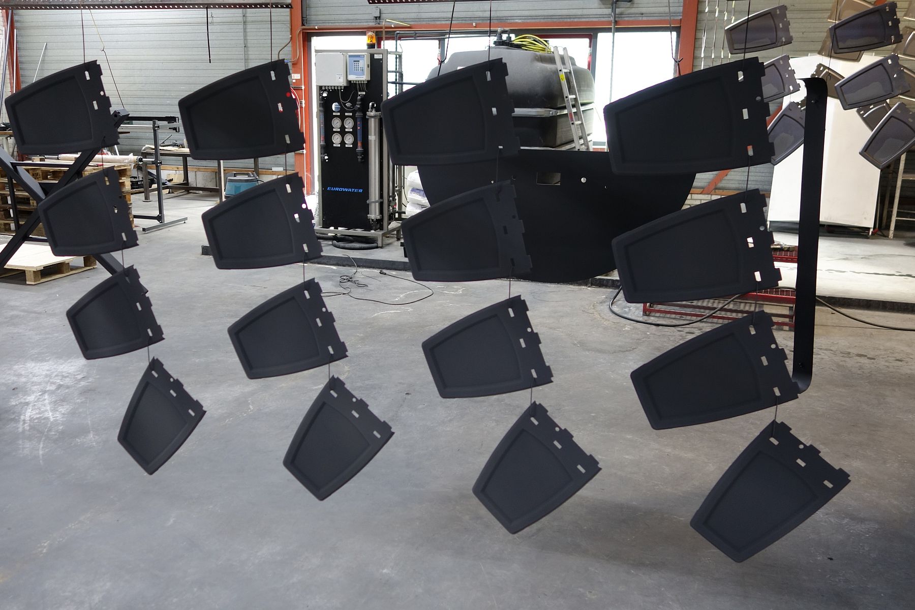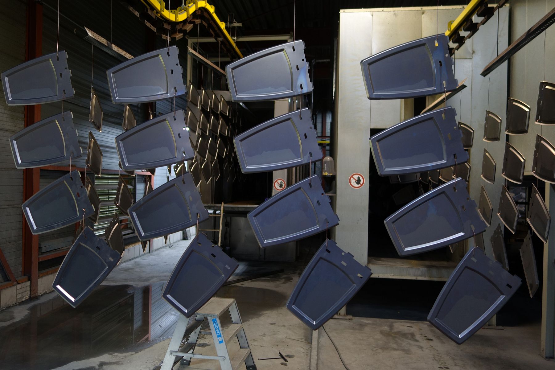 Gestart werd met de voorbehandeling, waarbij alle grondplaten in onze productielijn werden gehangen, waarna ze grondig werden ontvet. Vervolgens werd er op elk onderdeel een fosfaatlaag aangebracht, wat een goede hechting van de coating bevordert. Aansluitend volgde het spoelen met demiwater en hierna werden de grondplaten gedroogd.