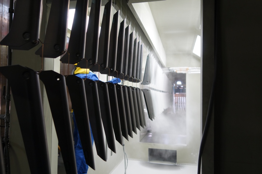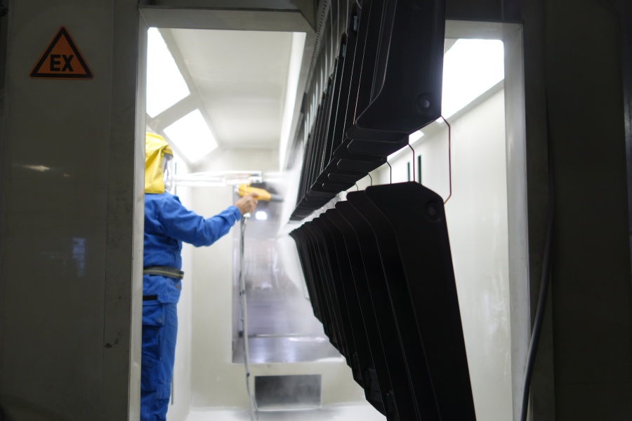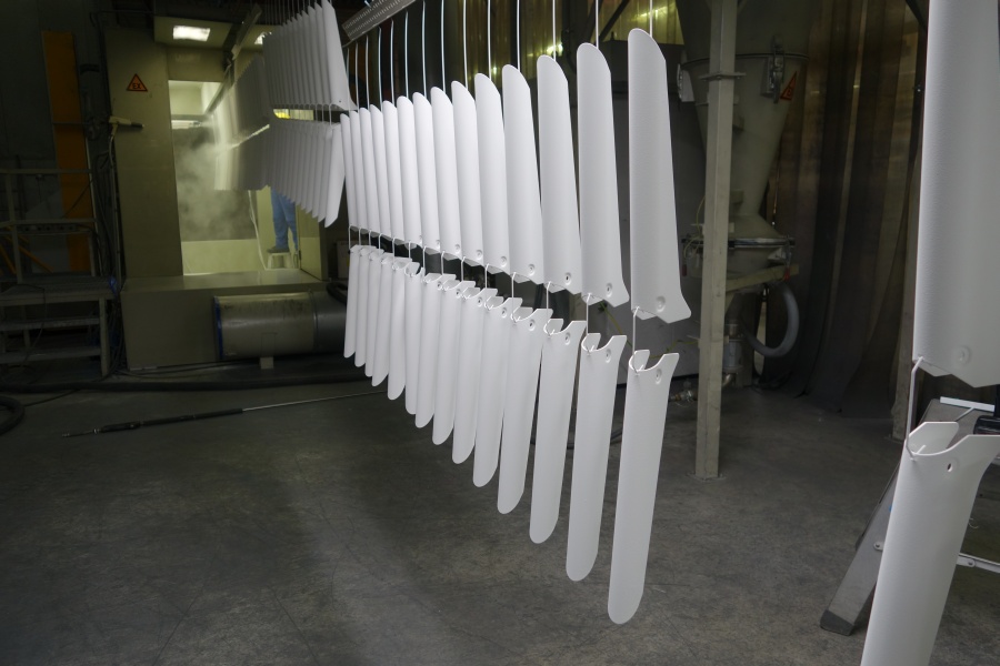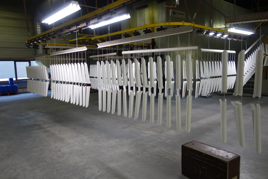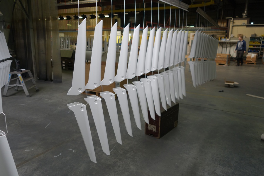 Na de chemische voorbehandeling zijn de stalen profielen gedroogd. Vervolgens is de coating aangebracht, een enkellaags mat witte coating: RAL 9016. Aan de binnenkant zijn de profielen handmatig gespoten. De stalen profielen zijn vervolgens 12 minuten op 190 graden de moffeloven ingegaan.